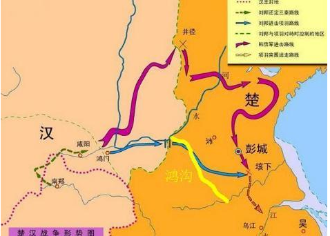 围绕着“鸿沟”而展开的象棋文化博大精深,蕴涵着人生和智慧的底色。楚、汉在广武山隔鸿沟对峙,使鸿沟成为楚汉河界,催生了楚河汉界象棋;楚、汉以鸿沟为界的核心内容是“中分天下”,象棋棋盘秉承了这一观念;黑、红棋予以鸿沟为界,寓示双方是为了夺取天下、夺得政权;“楚河汉界”棋盘的两边, 各由“竖九横五”的纵横线组成,喻指“九五之争”。这都十分清晰地表明象棋双方博弈的核心理念源于楚汉对峙的历史事实,而“斗智不斗力”更是象棋运动的精髓。